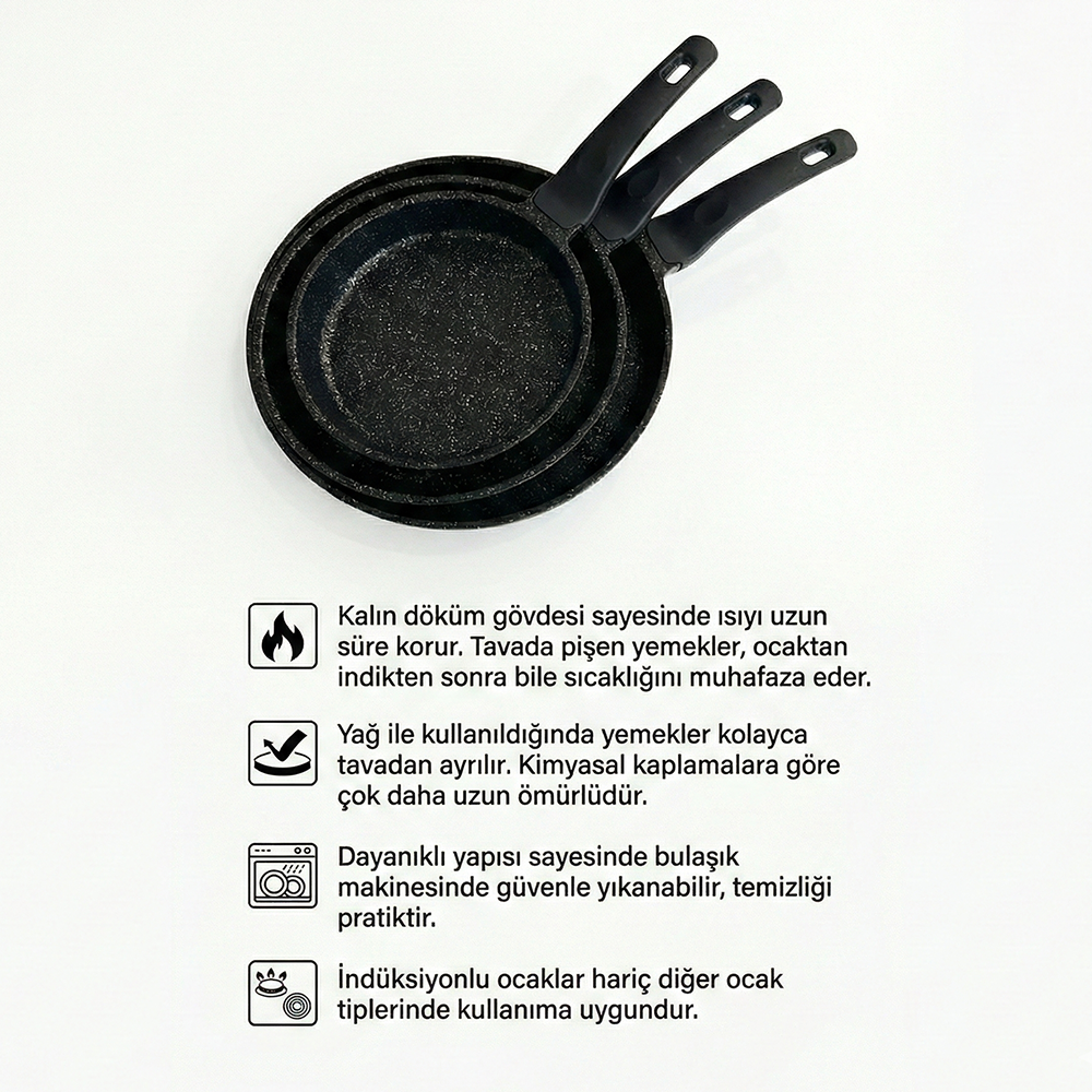 Döküm Yanmaz Yapışmaz 3’lü Tava Seti (20-24-28 cm)