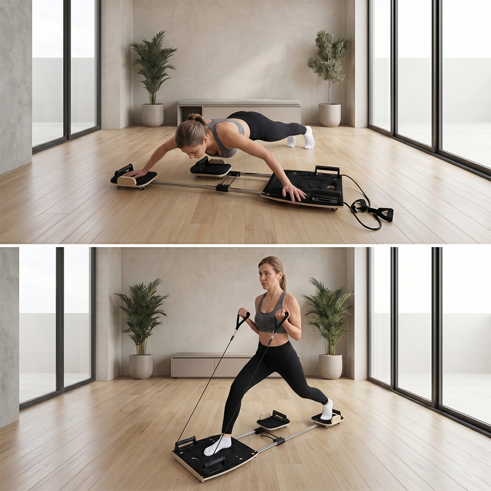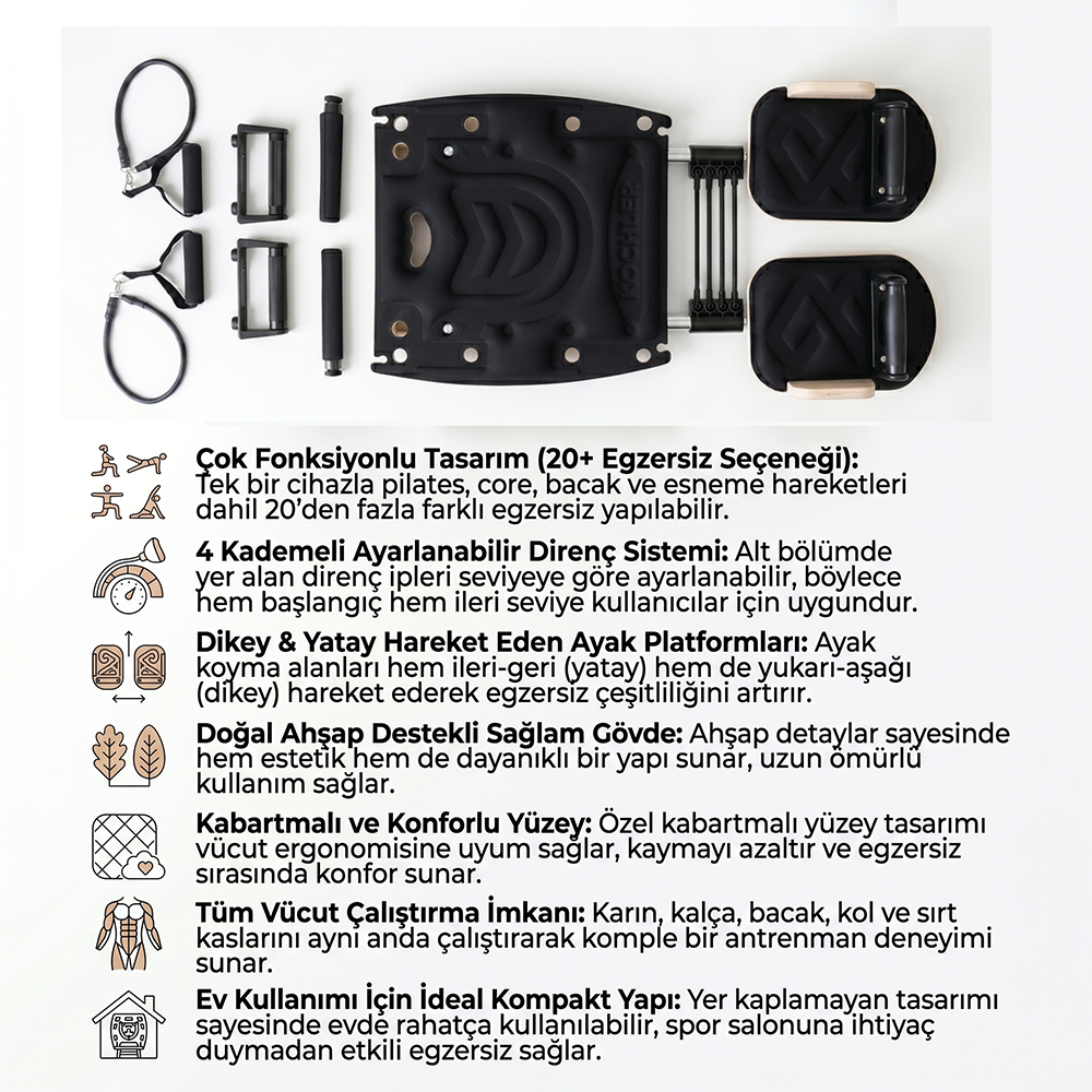 Çok Fonksiyonlu Ahşap Pilates Aleti – 4 Kademeli Dirençli, 20+ Egzersiz, Kaydırmalı Platform Sistemi