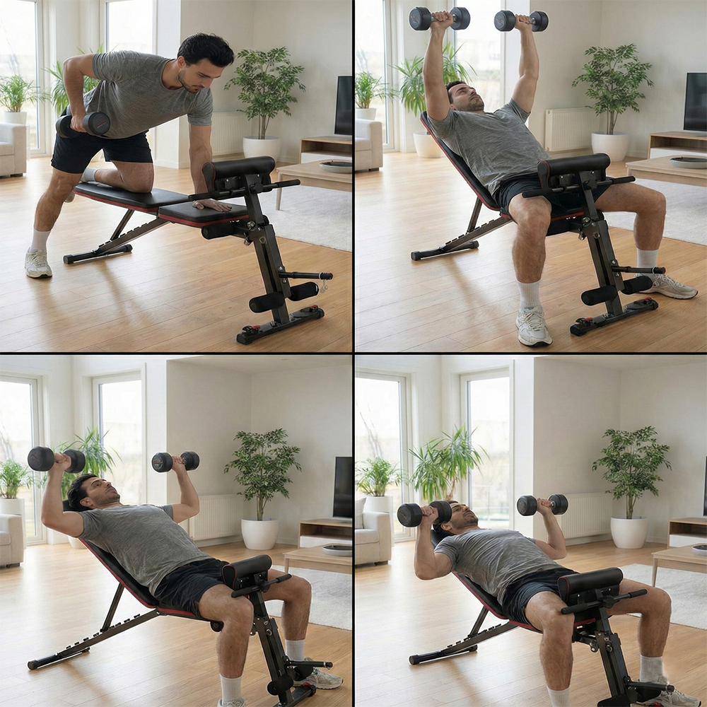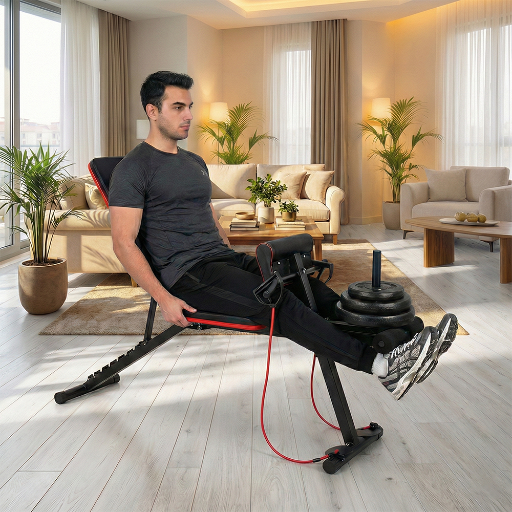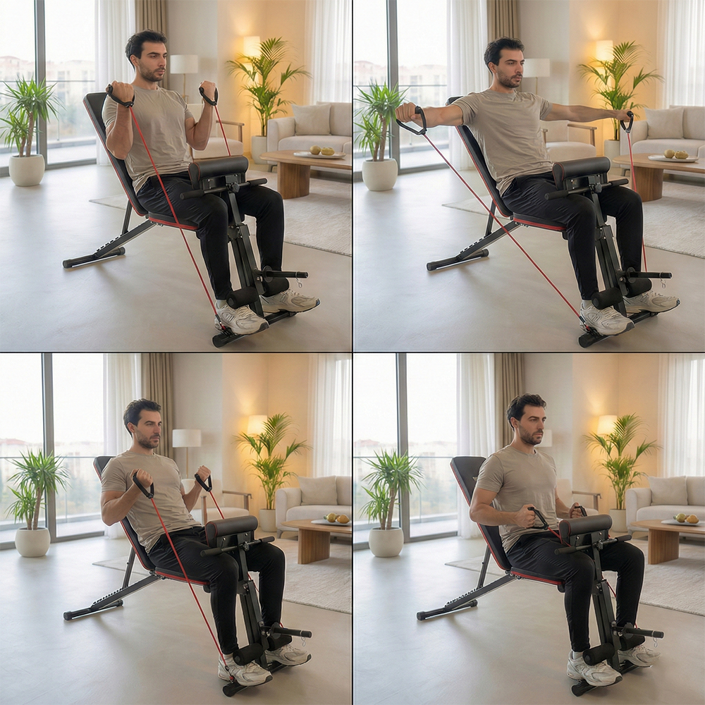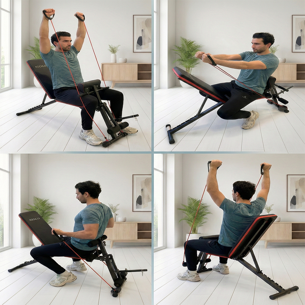 Evde profesyonel antrenman deneyimi yaşamak isteyenler için tasarlanan KOCHLER çok fonksiyonlu egzersiz sehpası, tek bir ürünle birden fazla hareket yapma imkânı sunar. Mekik, bench press, dambıl çalışmaları ve direnç lastiği egzersizleri için uygundur.
