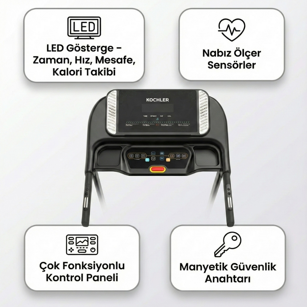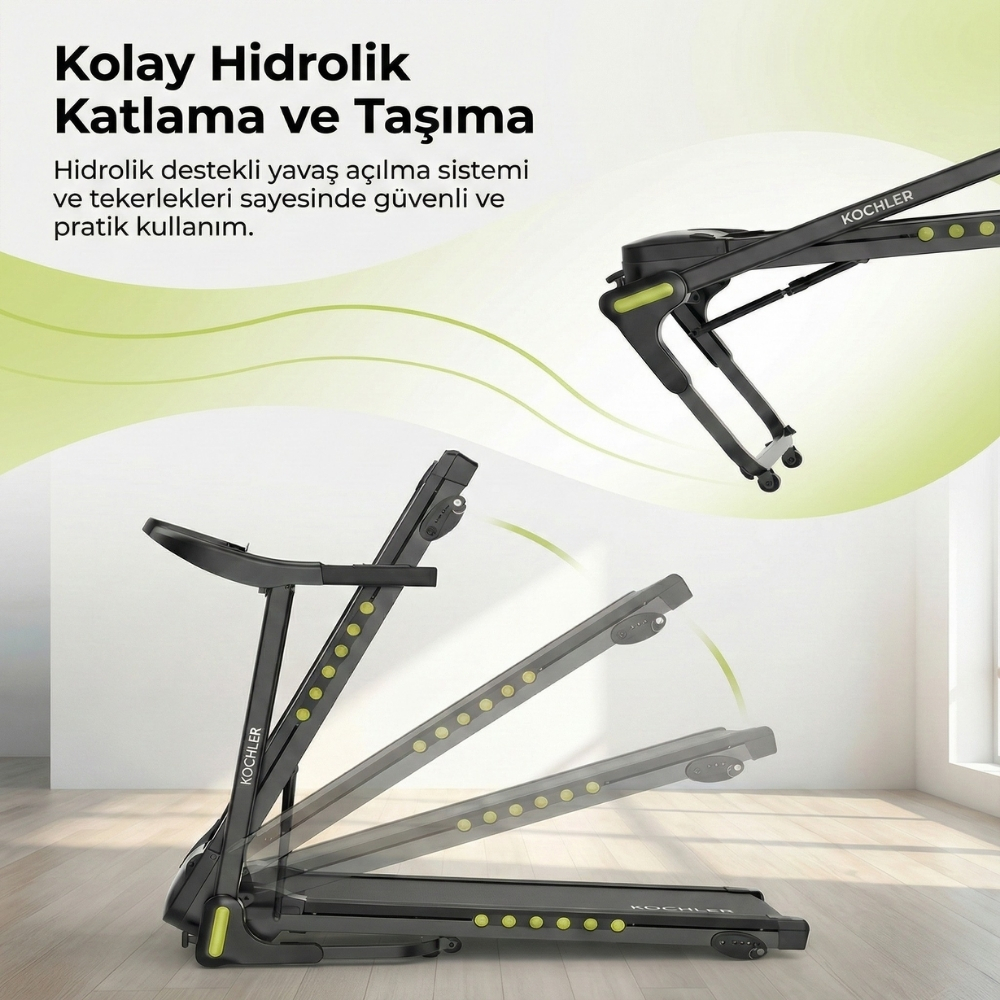 Kochler’in modern mühendisliği ile tasarlanan KCS204; sessiz çalışan güçlü motoru, 4 kademeli manuel eğim + %5 ayarlanabilir eğim, geniş 105 × 40 cm koşu yüzeyi, FitShow uygulama desteği, Bluetooth HNK_AUDIO bağlantısı ve amortisörlü katlanabilir yapısıyla evde antrenmanı en konforlu hale getirir. Kompakt tasarımı küçük evlerde bile kolay kullanım sunar; 110 kg taşıma kapasitesi ile her kullanıcıya hitap eder.