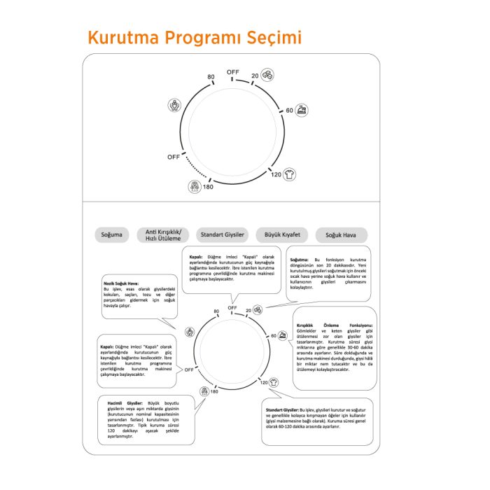 ❄️ Soğutma: Kurutmanın son 20 dakikasında giysileri soğutarak kolay çıkarılmalarını sağlar.
