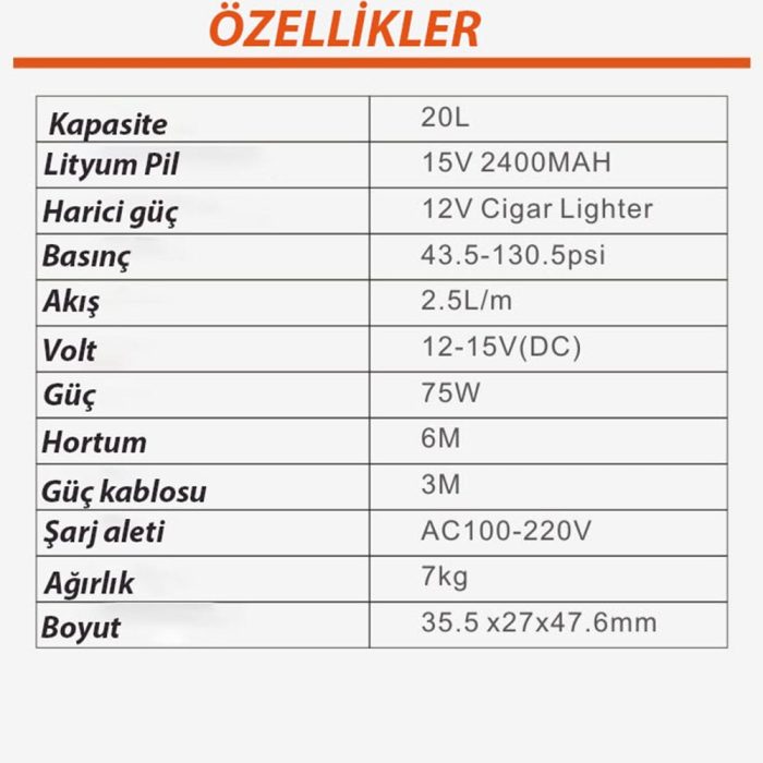 75 W,130 psi, şarjlıdır, 30 dakikaya kadar şarjlı olarak kullanabilirsiniz.