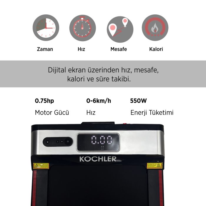 Dijital ekranı sayesinde hız, zaman ve kalori bilgilerinizi anında takip edebilirsiniz. 0-6 km/h hız aralığında ayarlanabilir hız özelliği ile ister yürüyüş ister koşu yapabilirsiniz. Ürün, tutma barı olmadan serbest egzersiz imkanı sunar ve ön tekerlekleri sayesinde kolayca taşınabilir.